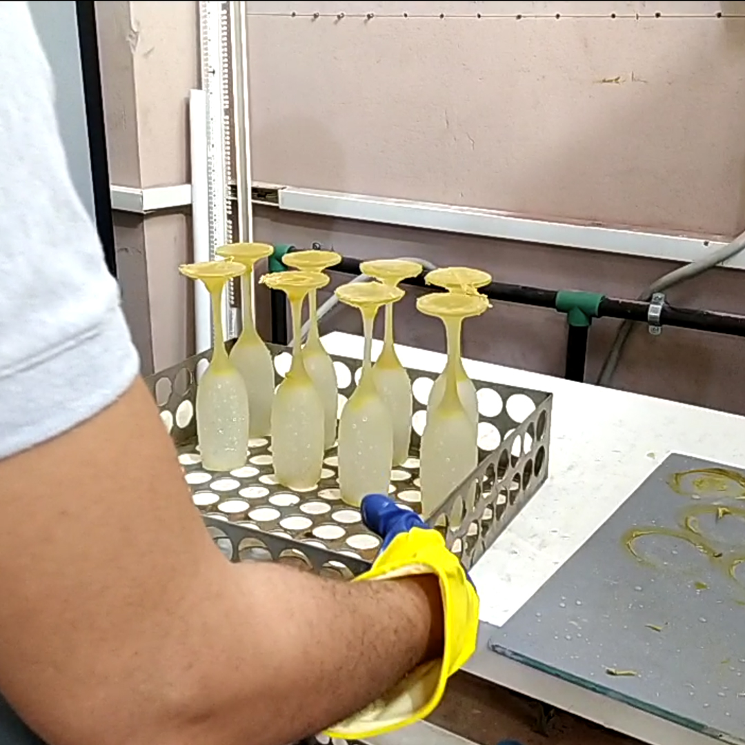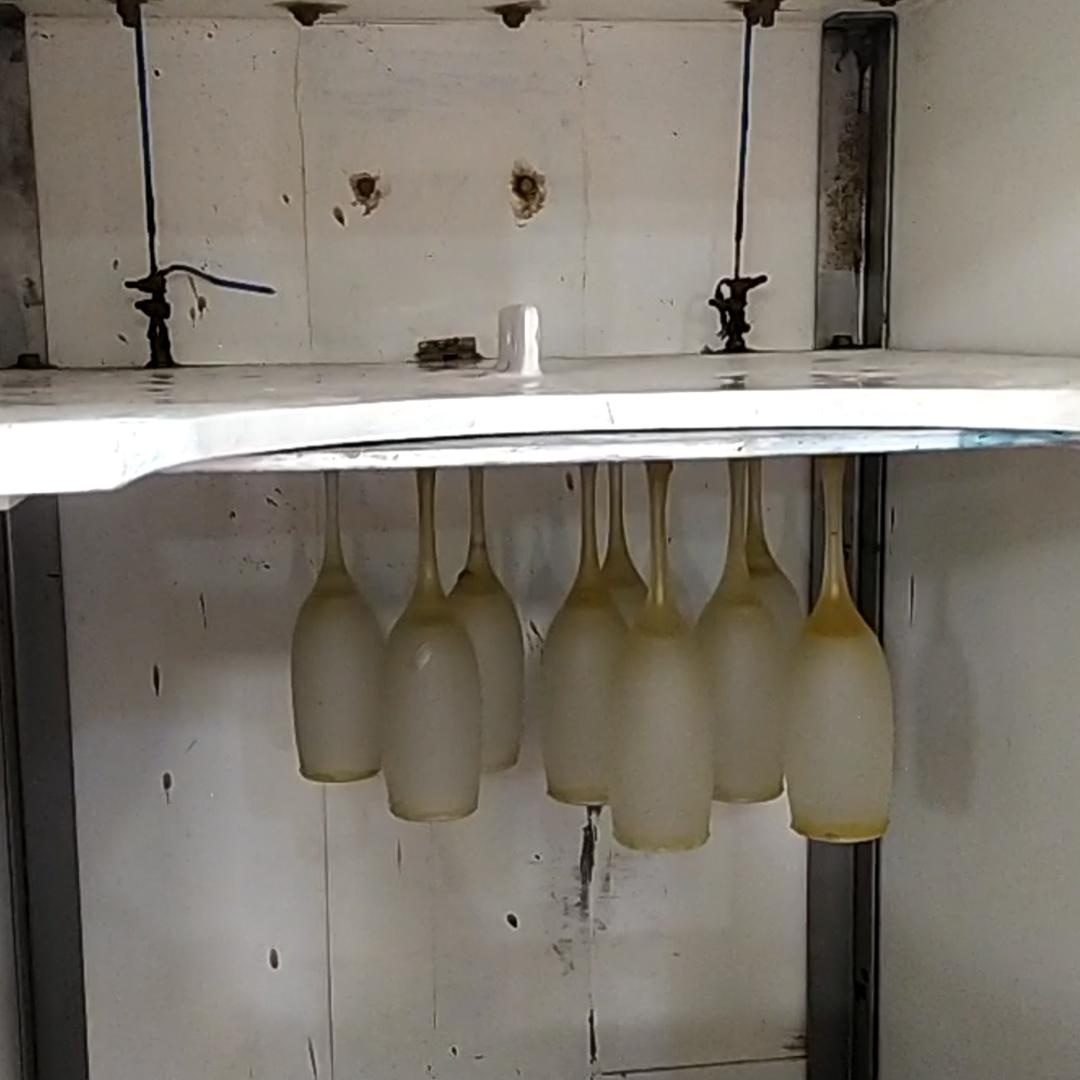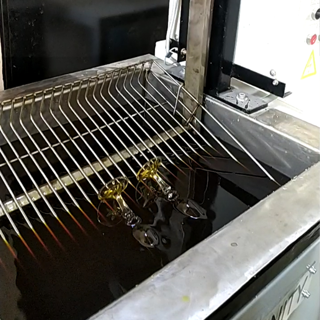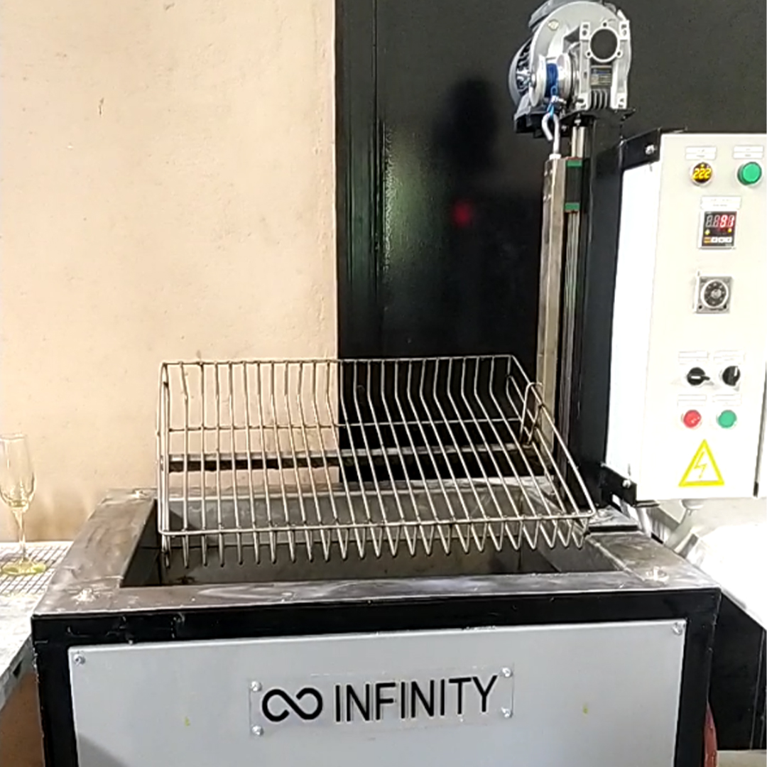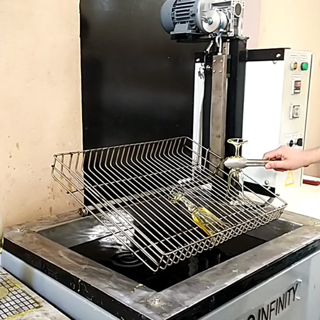 تقوم هذه الماكينة بتنزيل قطع الزجاج المختلفة إلى حوض الحامض لكي يقوم بالحفر على الزجاج عن طريق التفاعل الكيميائي بين الزجاج والحامض كي يعطي حفر لامع بدقة عالية ثم تقوم بغسل القطع بالمياه حتى تتيح للعامل التعامل المباشر بدون أي خطر.
