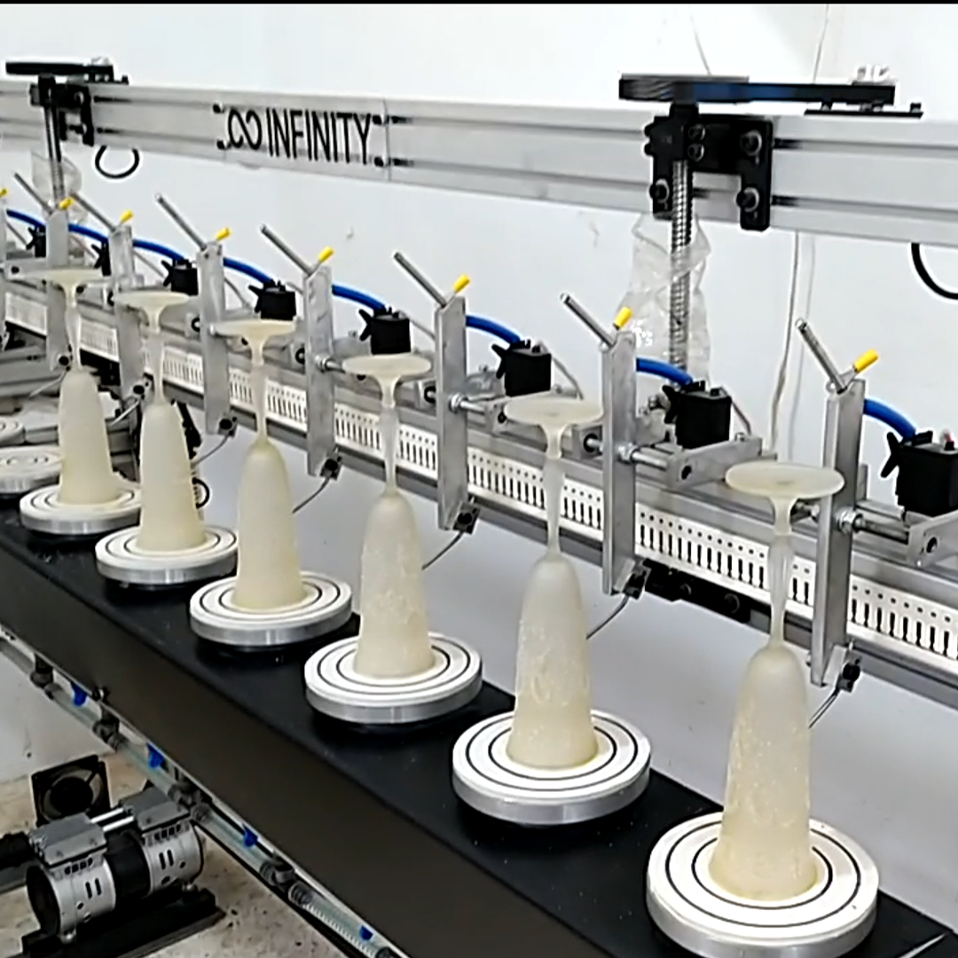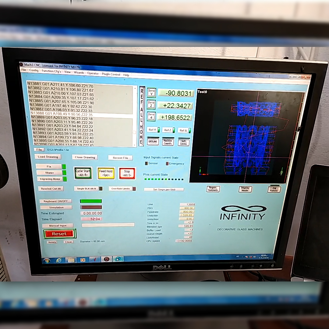 تقوم هذه الماكينة بتفريغ طبقة الشمع طبقا للتصميم المطلوب على قطع الزجاج والكريستال ذو الأشكال المختلفة الدائرية والمربعة وغير المنتظمة عن طريق أحدث البرامج للتصميم والتنفيذ من خلال هذه الماكينة ذو الثلاث محاور لضمان مستوي تفريغ ممتاز دون تقطيع .