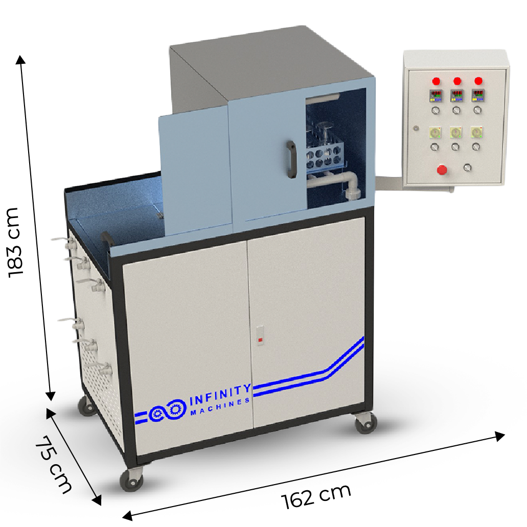 تقوم هذه الماكينة بغسيل قطع الزجاج بالمياه الساخنة حتى 95 درجة حتى يتم إزالة كامل طبقة الشمع من على القطع المطلوبة عن طريق مرحلتين لطلب العميل، أو ثلاث مراحل من الغسيل طبقا (دورة الغسيل دورة مغلقه لتوفير استخدام المياه)