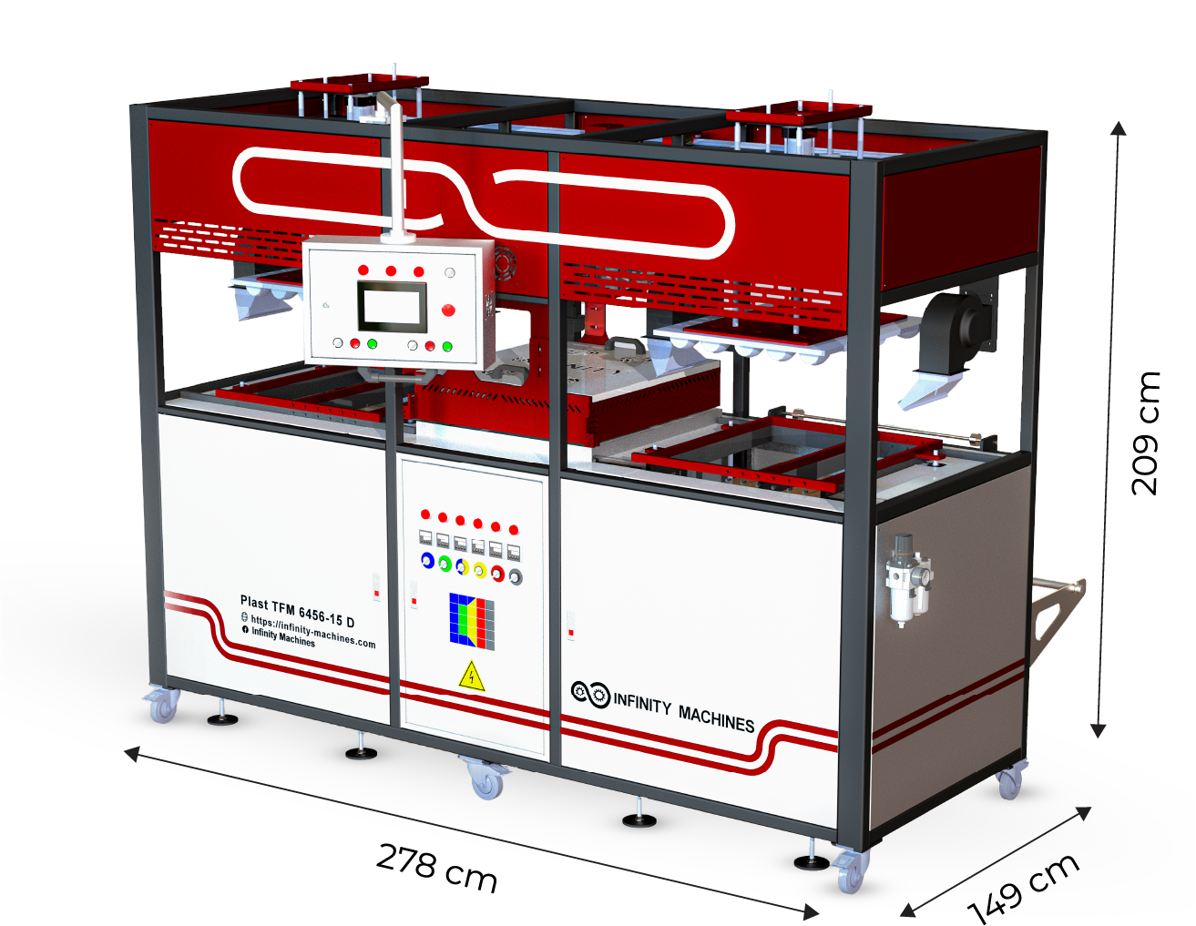 تستخدم هذه الماكينة في تشكيل كافة أنواع البلاستيك لكافة الأغراض عن طريق الحرارة والشفط القوي الذي يسمح بتشكيل أي سُمك.