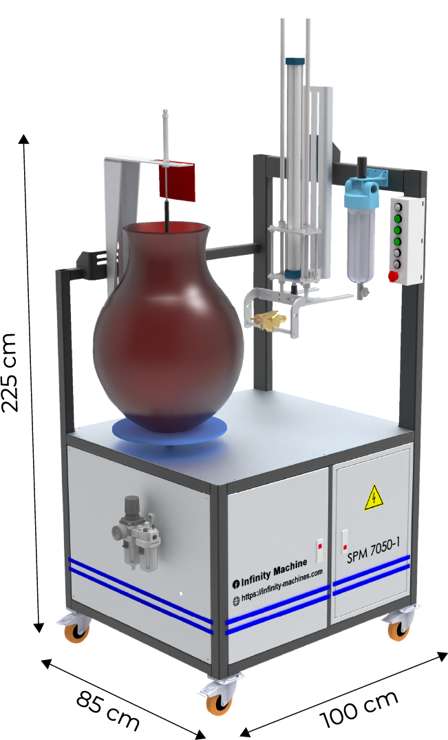 تستخدم هذه الماكينة في رش وتلوين القطع الزجاجية وغير الزجاجية بطبقة متجاننسة من اللون المطلوب، مع إمكانية التحكم في درجة وكثافة الرش للحصول على أفضل النتائج.